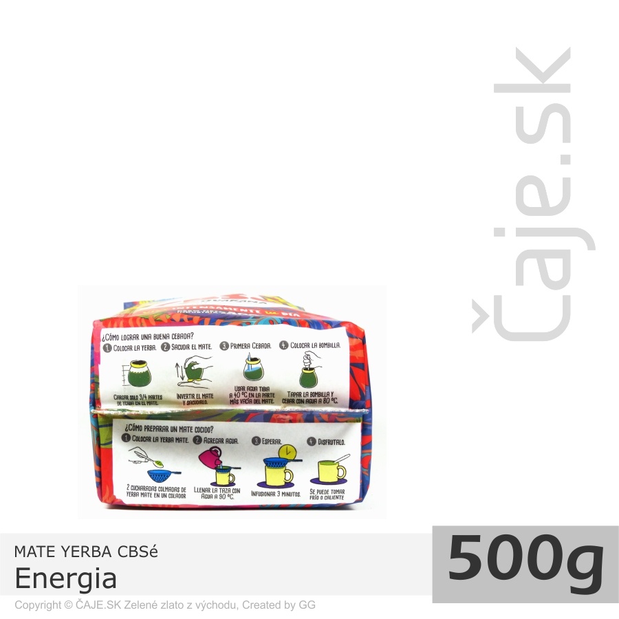 Yerba Mate Energia s guaranou. Guarana silne stimuluje energiu kombináciou Yerby (špeciálne pestovanej na čistých plantážach) a mäty. Táto kombinácia má stimulačné účinky a zlepšuje trávenie žalúdka. Stimuluje produkciu žlče, zlepšuje funkciu čriev. Vitamín B1 v jednej porcii je 92% dennej dávky. Pitie dvakrát denne, pomáha znižovať a kontrolovať distribúciu sacharidov a tukov. Yerba Mate je ideálne pre ľudí, ktorí hľadajú dobrý spôsob, ako schudnúť. Ideálny na 3 týždňový kurz chudnutia. Teplý i studený nápoj na dlho uhasí smäd.