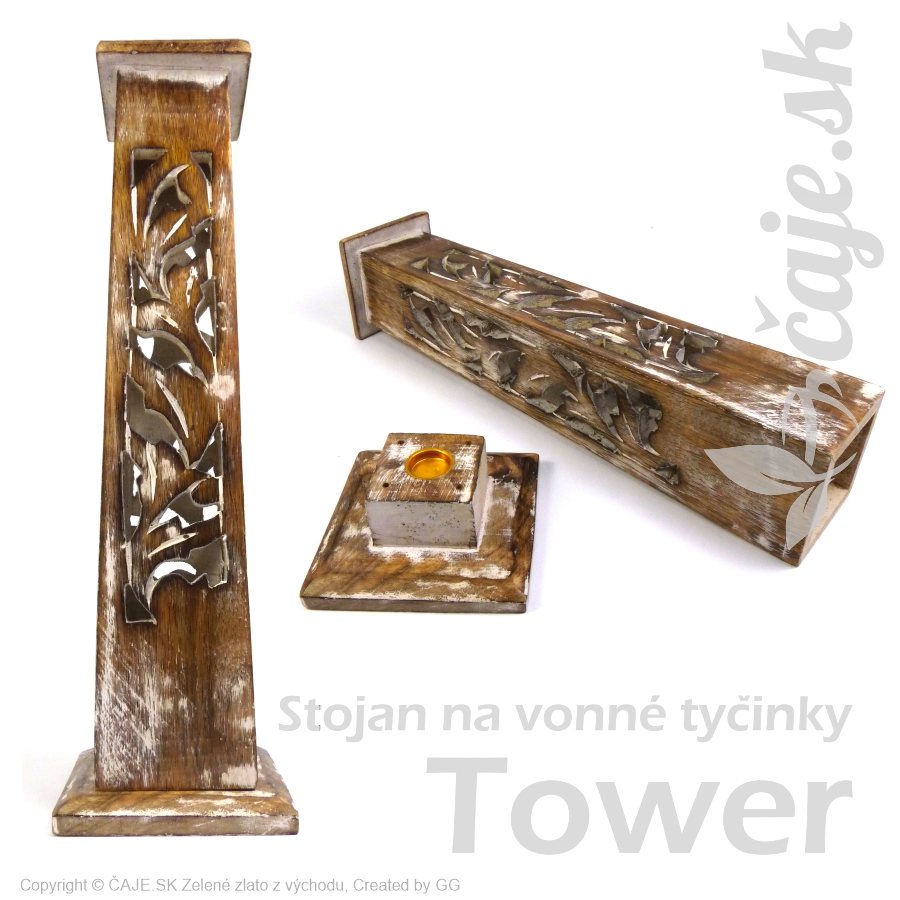 Stojan Tower je určený na uchytenie až štyroch vonných tyčiniek po ich zapálení. Stojan je vhodný aj na vonný kužeľ. Dym prechádza cez vyrezávané otvory v stojane, čím vzniká pekný efekt. Po postupnom spaľovaní tyčinky popol odpadáva na stojan, odkiaľ je ho možne jednoducho vysypať čím nám nevzniká prípadný neporiadok.